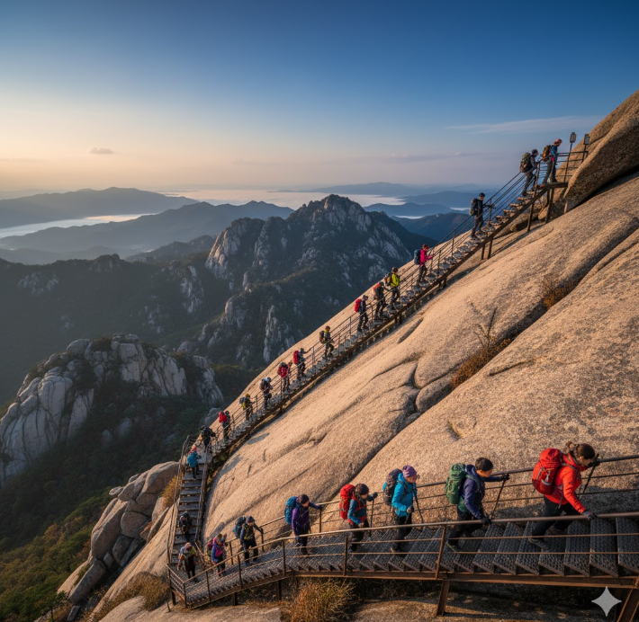 중급자라면 울산바위 코스(왕복 4~5시간) 를 추천합니다. 888개의 계단을 오르면 탁 트인 동해 전망이 감탄을 자아냅니다.