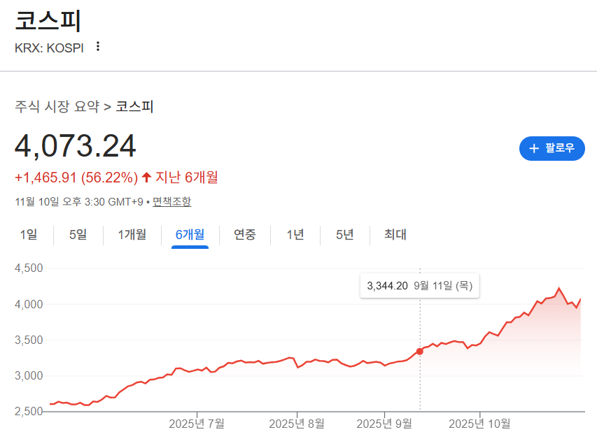 최근 코스피 지수는 4,100선을 안정적으로 유지하며 강한 상승 흐름을 이어가고 있습니다.