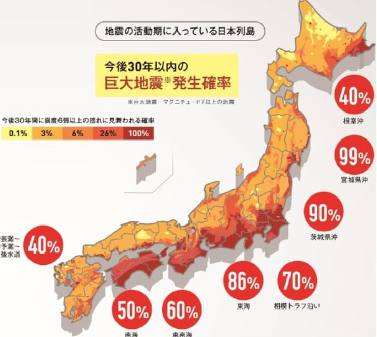 특히 ‘수도 직하 지진’ 가능성이 꾸준히 언급되며, 도쿄는 일본 내에서도 상위 위험 지역으로 분류된다.