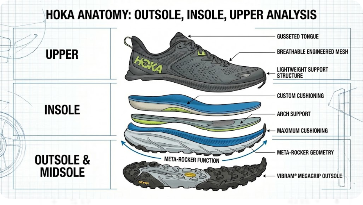기존의 거대 스포츠 브랜드인 나이키나 아디다스와 비교했을 때 호카가 가진 가장 큰 차별점은 독자적인 '메타-로커(Meta-Rocker)' 기술과 압도적인 미드솔 볼륨에 있습니다.