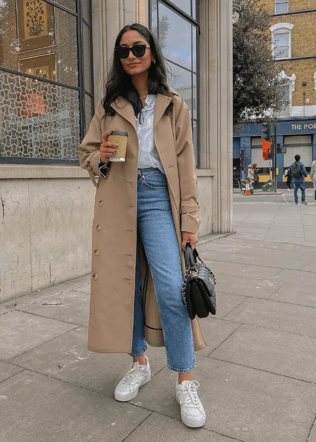 - 베이지색 트렌치코트에 니트와 데님 팬츠를 매치하여 시크하면서도 여성스러운 분위기를 연출할 수 있습니다.