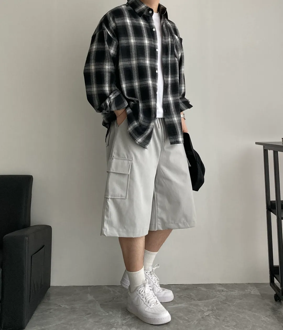 - 체크 셔츠와 카고 팬츠를 활용하여 자연스럽고 편안한 스타일을 완성할 수 있습니다.