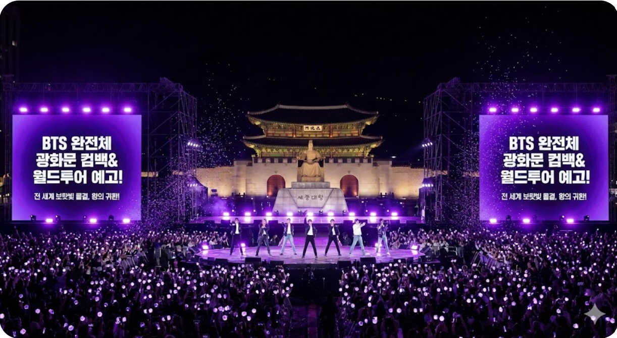 그들의 음악이 세상을 밝히고 우리들의 마음을 어루만져 주었던 그 따뜻한 순간들을 이제 다시 일상 속에서 마주하게 될 것입니다. 자, 이제 모두 아미밤의 배터리를 체크하고 그들이 전할 새로운 이야기와 멜로디에 귀를 기울일 시간입니다. 앞으로 펼쳐질 **BTS의 찬란한 두 번째 막(Chapter 2)**을 진심으로 응원하며, 우리 모두 광화문에서 기쁜 마음으로 만나요!