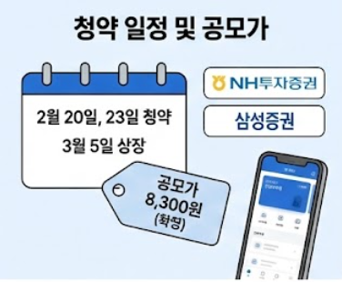일반 투자자분들이 참여할 수 있는 청약일은 2월 20일과 23일 이틀간 진행되니 일정을 놓치지 않도록 미리 알람을 설정해두시는 것이 좋겠습니다. 주관사는 NH투자증권과 삼성증권이 대표 주관을 맡았고 신한투자증권이 인수단으로 참여하므로, 본인이 보유한 계좌를 확인하여 미리 청약 자금을 준비하시길 권장합니다.