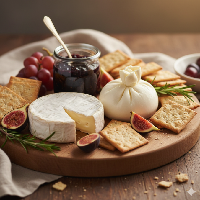 - 트리플 크림 브리, 부라타, 무화과잼 등 수입 치즈와 델리류의 정성스런 구성